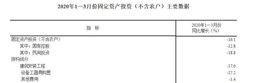 一季度,全国固定资产投资(不含农户)84145亿元,同比下降16.1%,降幅比1-2月份收窄8.4个百分点。其中,基础设施投资下降19.7%,建筑安装工程投资同比下降17.6 %。